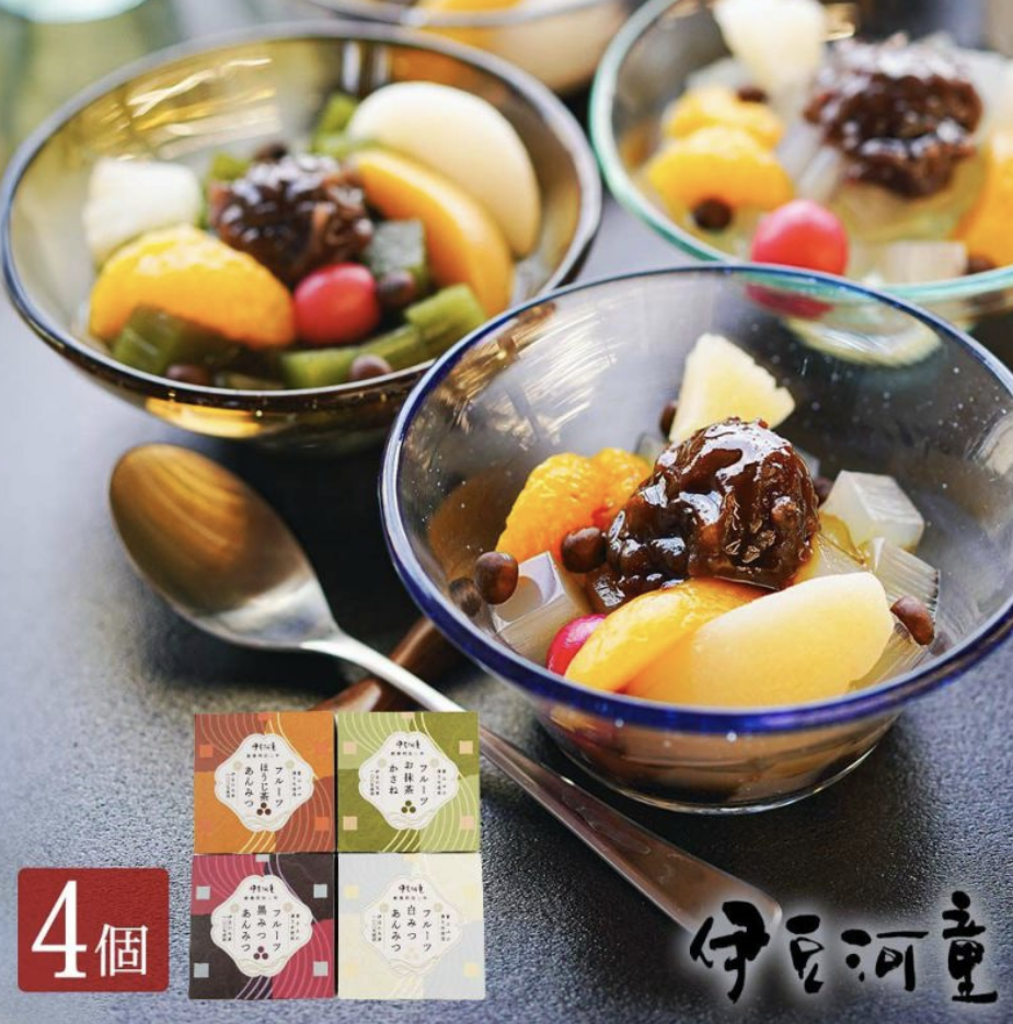 伊豆河童のフルーツあんみつ4個セットは、伊豆産の天草(テングサ)を通常の2倍以上使った角切りところてんに、果物と、京都の老舗製あん所で作る北海道産小豆100%の上品な甘さのあんこ、沖縄産黒蜜を100%使った黒蜜を組み合わせた贅沢スイーツ。
