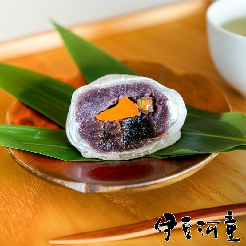 伊豆河童の角切りところてんを黒糖で煮て、あんみつのみかんと赤えんどう豆と一緒にこしあんで包み、大福に仕立てました。