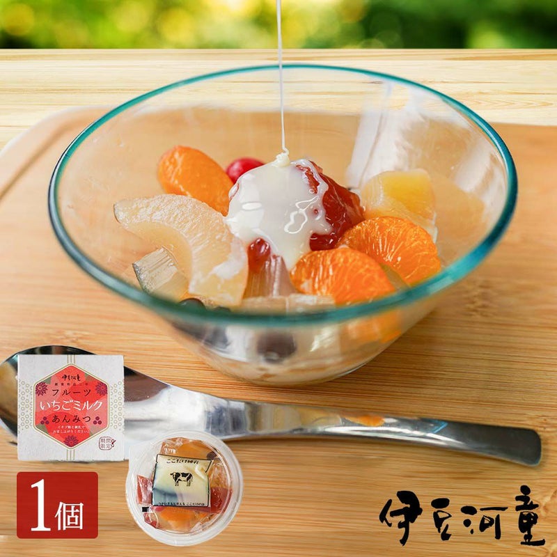 伊豆河童オリジナルの「フルーツいちごミルクあんみつ」で、目でも舌でもいちごを存分に味わってください。いちご餡と練乳、フルーツの彩りも鮮やかなフルーツあんみつです。