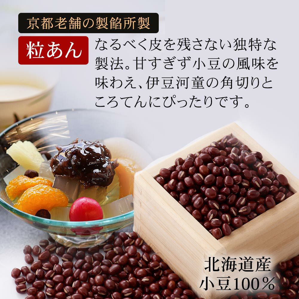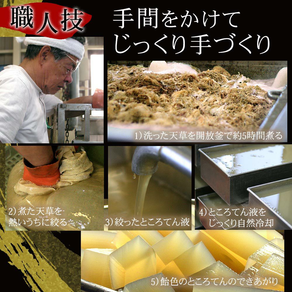 河童のあんみつは、磯の風味が豊かなところてんを使った珍しいあんみつです。ところてんは天草をじっくりと煮出した後にしぼり、ところてん液をゆっくりと自然冷却して作ります。寒天とは食感や風味が違い、しっかりとしたコリコリ感、サクッとした心地よい歯切れのよさがあり、寒天よりも多くの海藻のミネラル分を含んでいます。