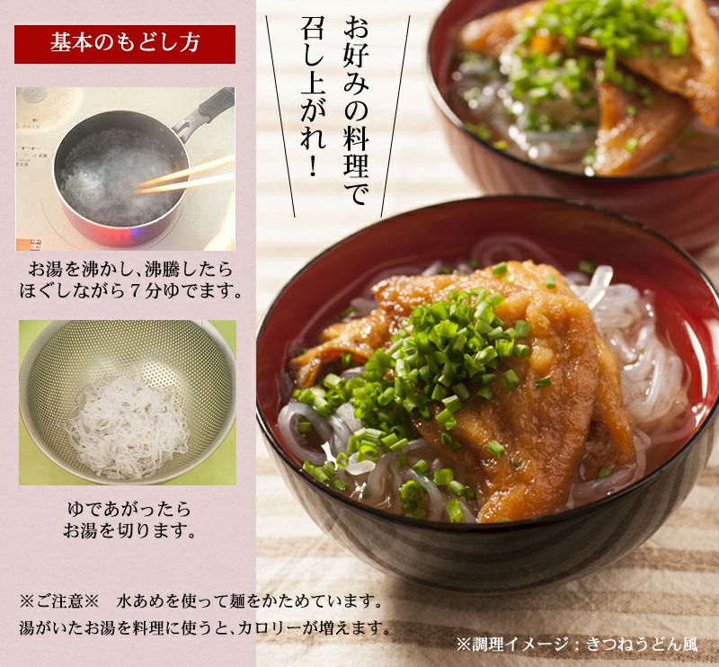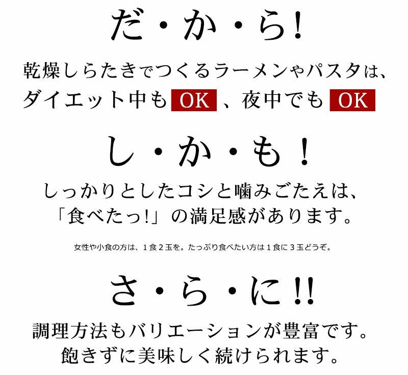 「食べ飽きちゃった」とは言わせません。アレンジ自在なのも、乾燥しらたきのよいところです。調理しやすい材料なので、ご自身でお好みの料理や味付けでお召し上がりください。ダイエットこんにゃくパスタや、ダイエットこんにゃくラーメンなどの麺としてお使い下さい。