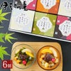 ・フルーツ黒蜜あんみつ(角心太95g、餡35g、蜜25g、フルーツ)×2、フルーツ白蜜あんみつ(角心太95g・餡35g・白蜜20g、フルーツ)×2、フルーツお抹茶かさね(抹茶入り角心太95g、餡35g、抹茶蜜25g、フルーツ)×1、フルーツほうじ茶あんみつ(ほうじ茶入り角心太95g、餡35g、ほうじ茶蜜25g、フルーツ)×1 計6個