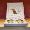 6種の味(各2個):茶(小豆)、緑(青柚子)、黄(ニューサマーオレンジ)、桜(桜葉)、橙(びわ)、青(塩)
