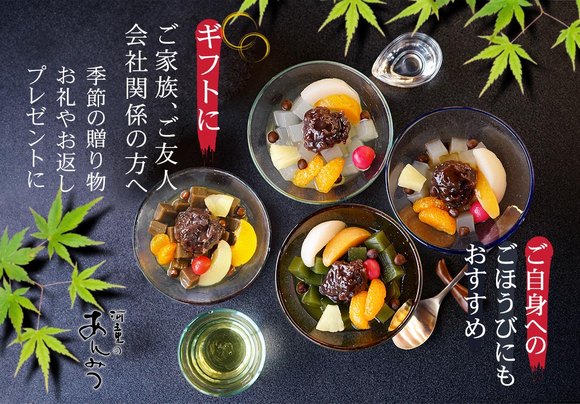 心を込めて手づくりした「フルーツあんみつ」は、季節の贈り物(ギフト)や特別な日、大切な方へのプレゼントに最適です。最高級の伊豆天草、柿田川名水、昔ながらの製法で丁寧に作ったところてんでつくる「フルーツあんみつ」は、贈る方の気持ちを豊かに表現します。