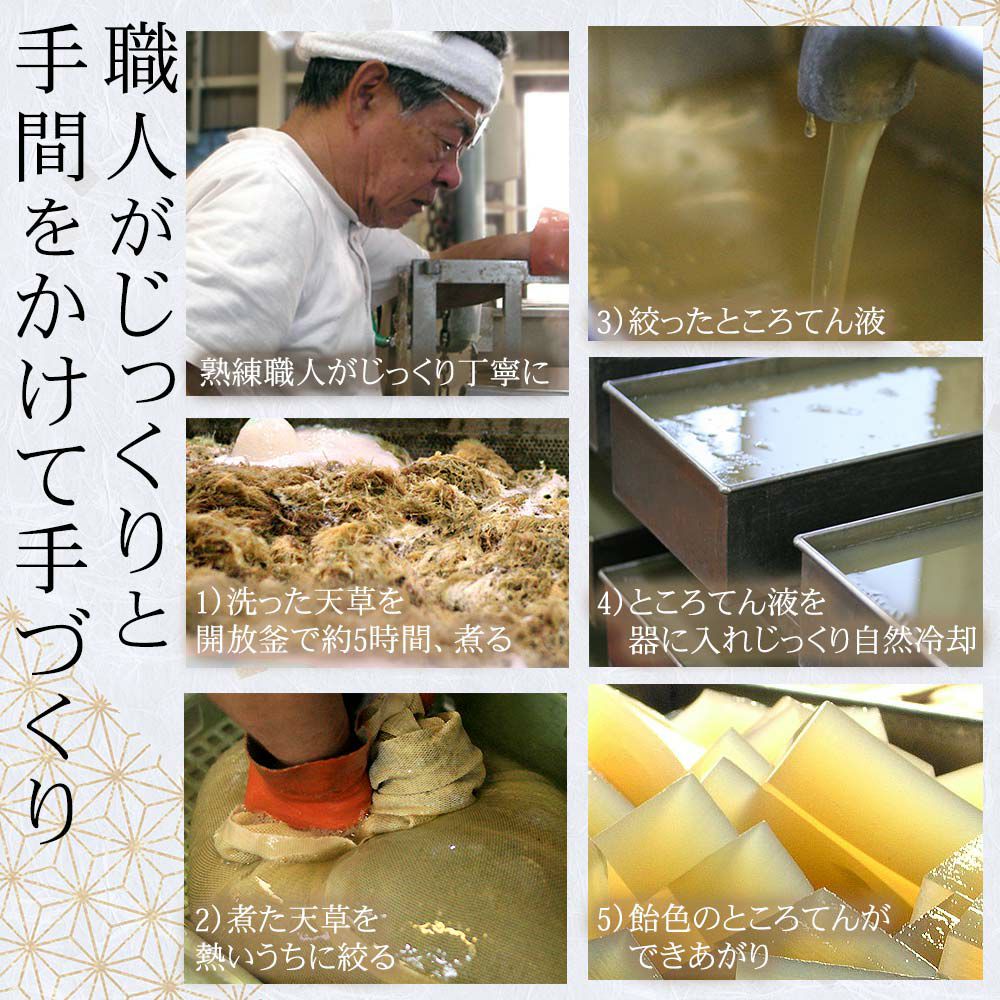 使う天草の量は、通常の2倍。たっぷりの量を使いコシのある、磯の香りも爽やかなところてんができあがります。伊豆半島の天草は高級天草として知られていて、他の天草よりも2倍ほど高値となっています。