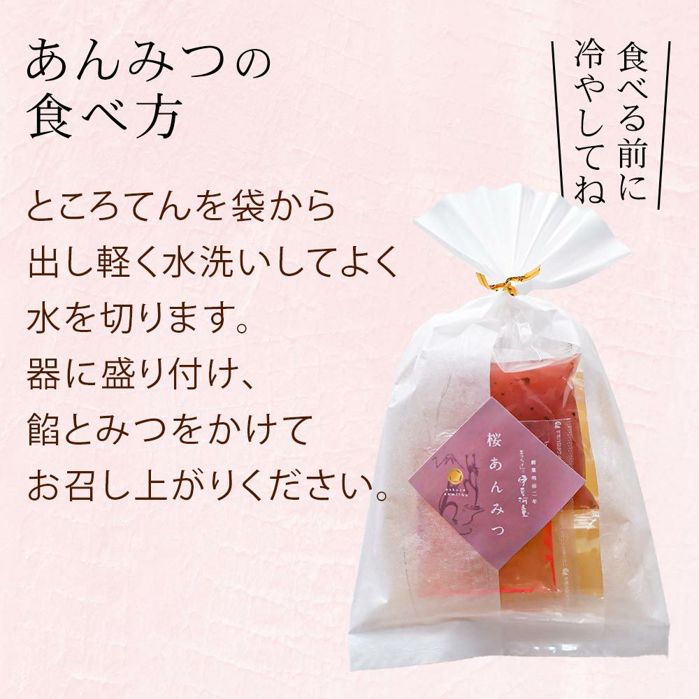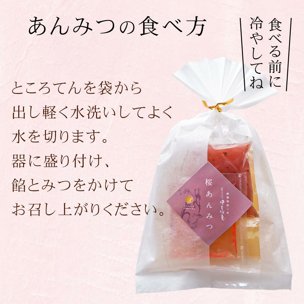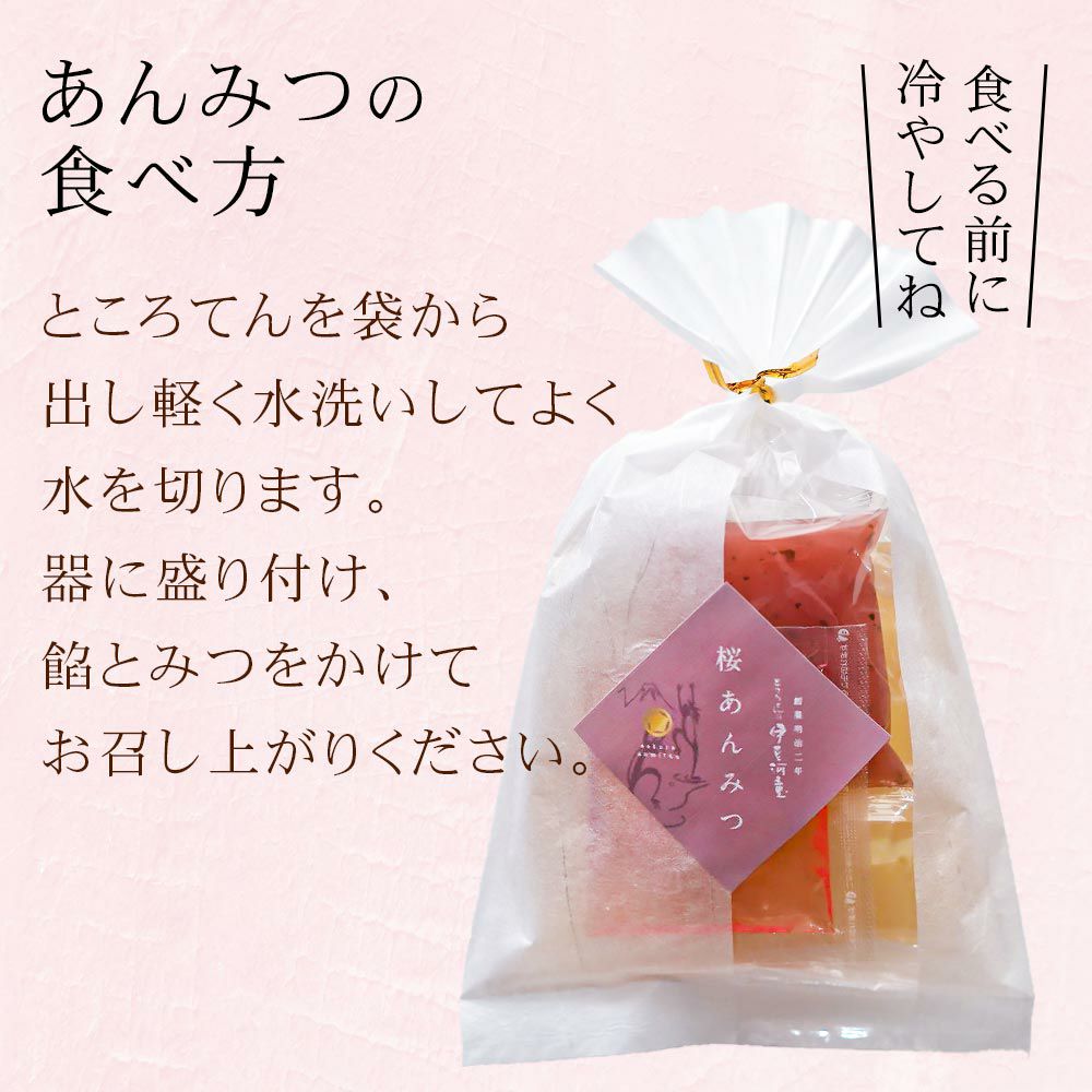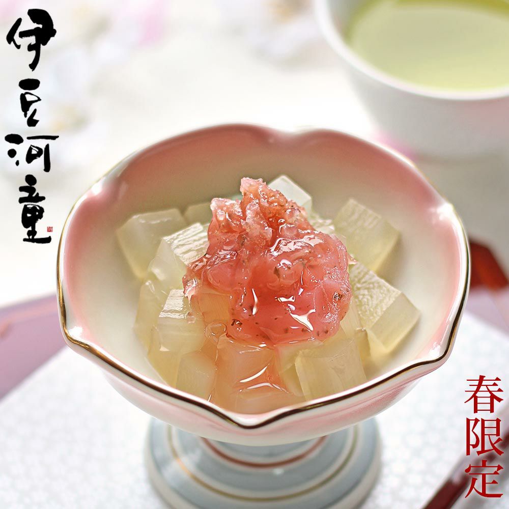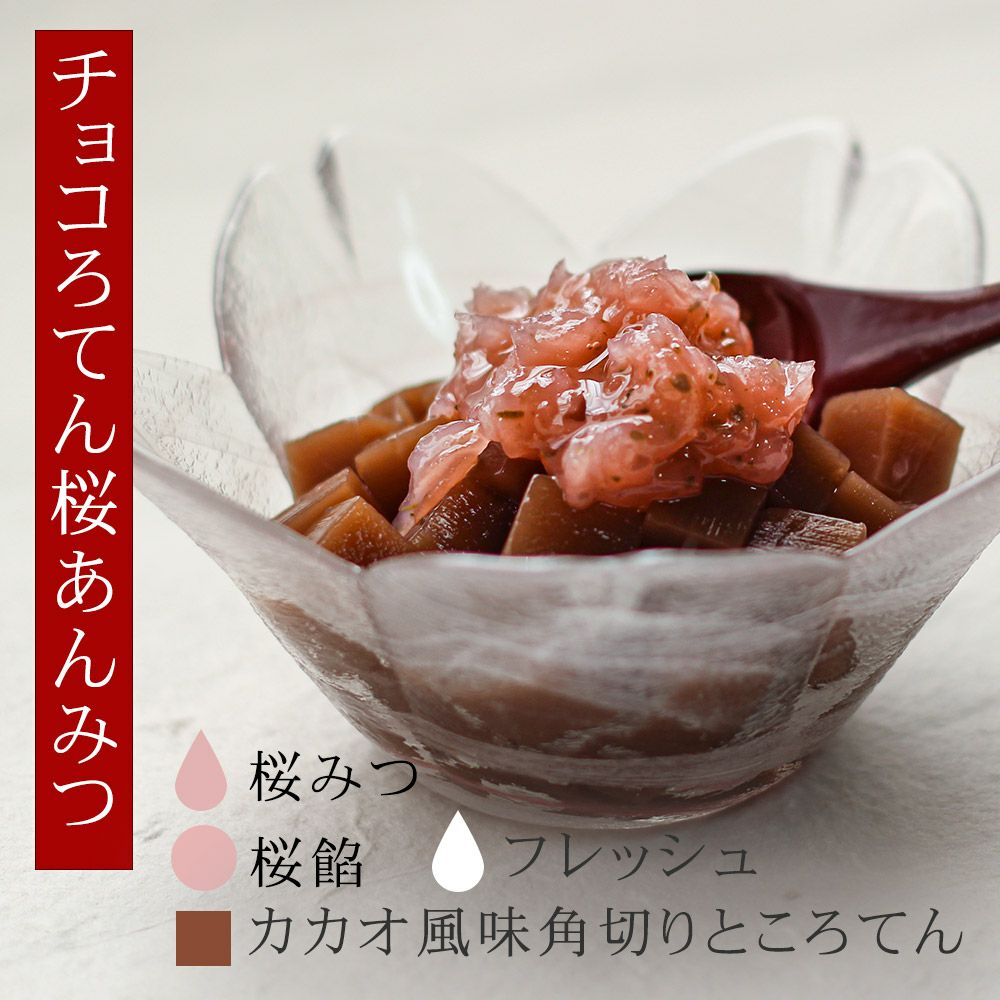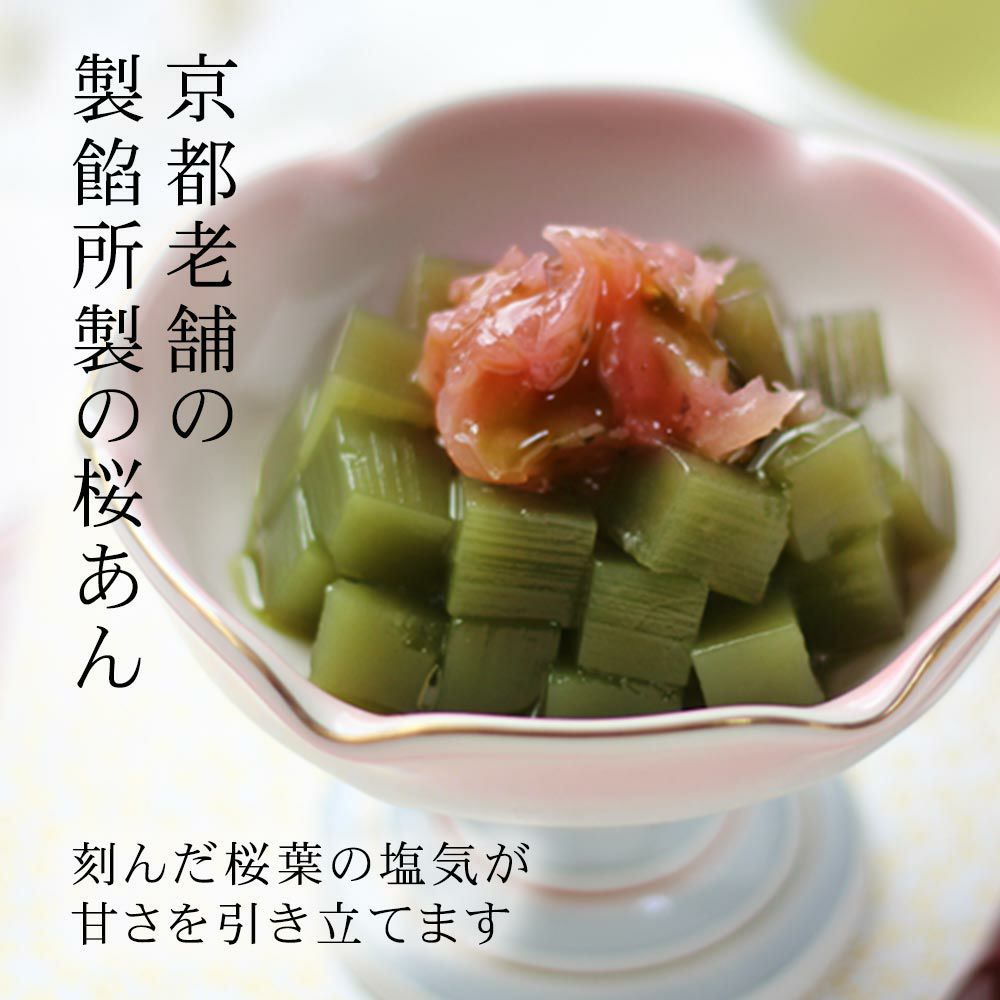 京都老舗の製餡所特製のさくら餡は、塩漬けの桜の葉を刻み練りみ、ほんのり桜の香りがします。伊豆河童の角切りところてんにぴったりと合います。