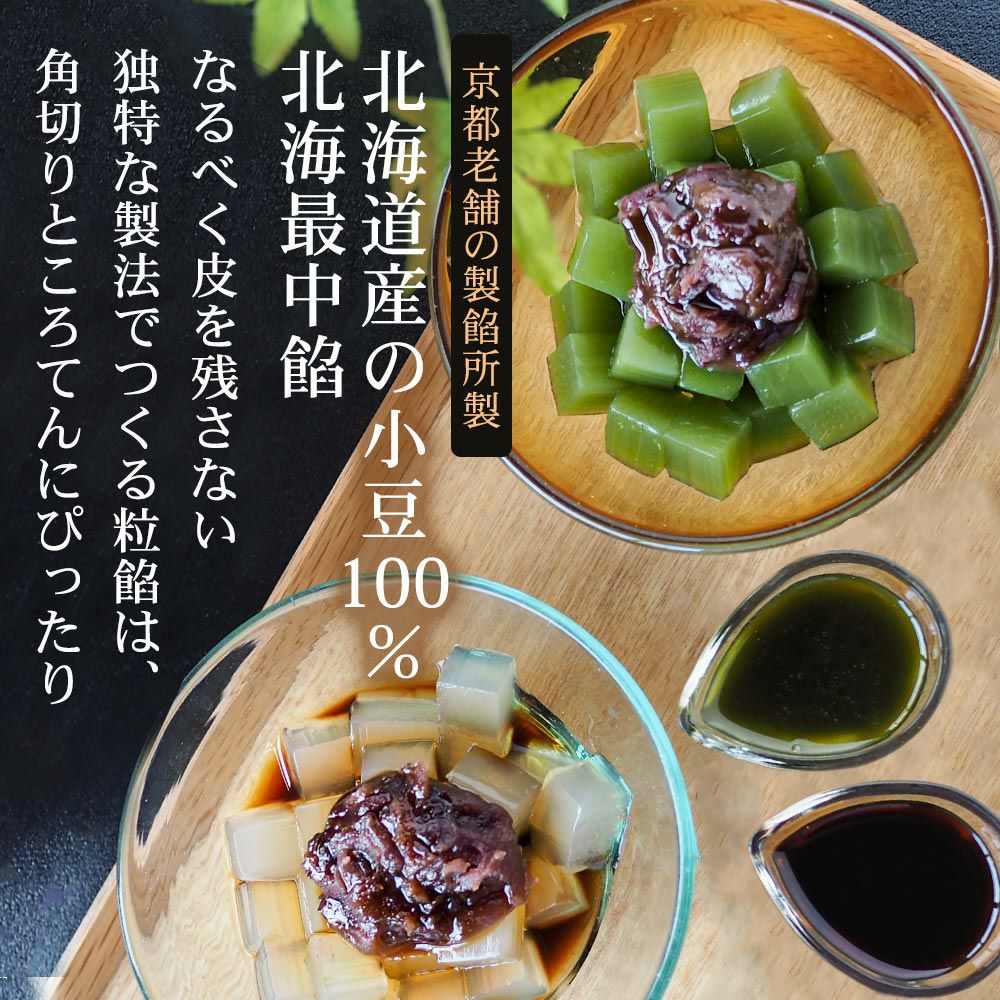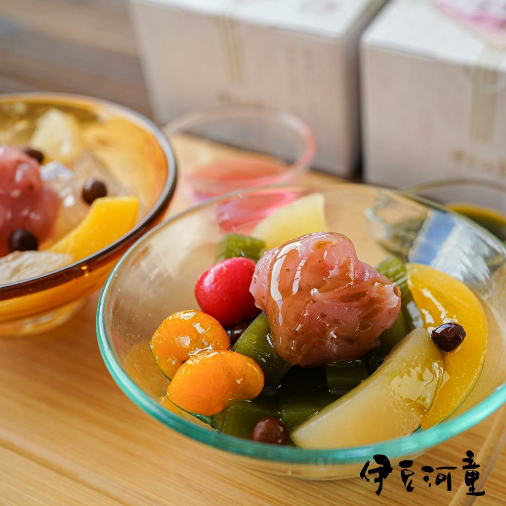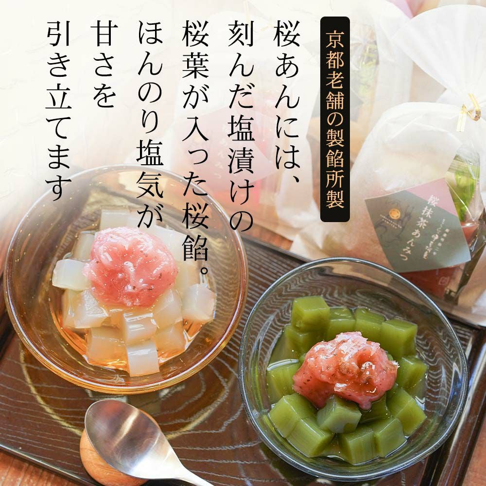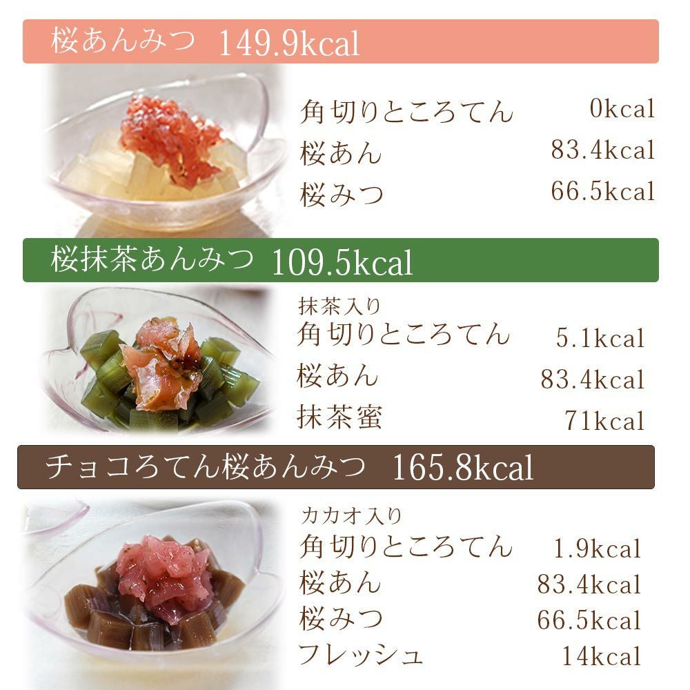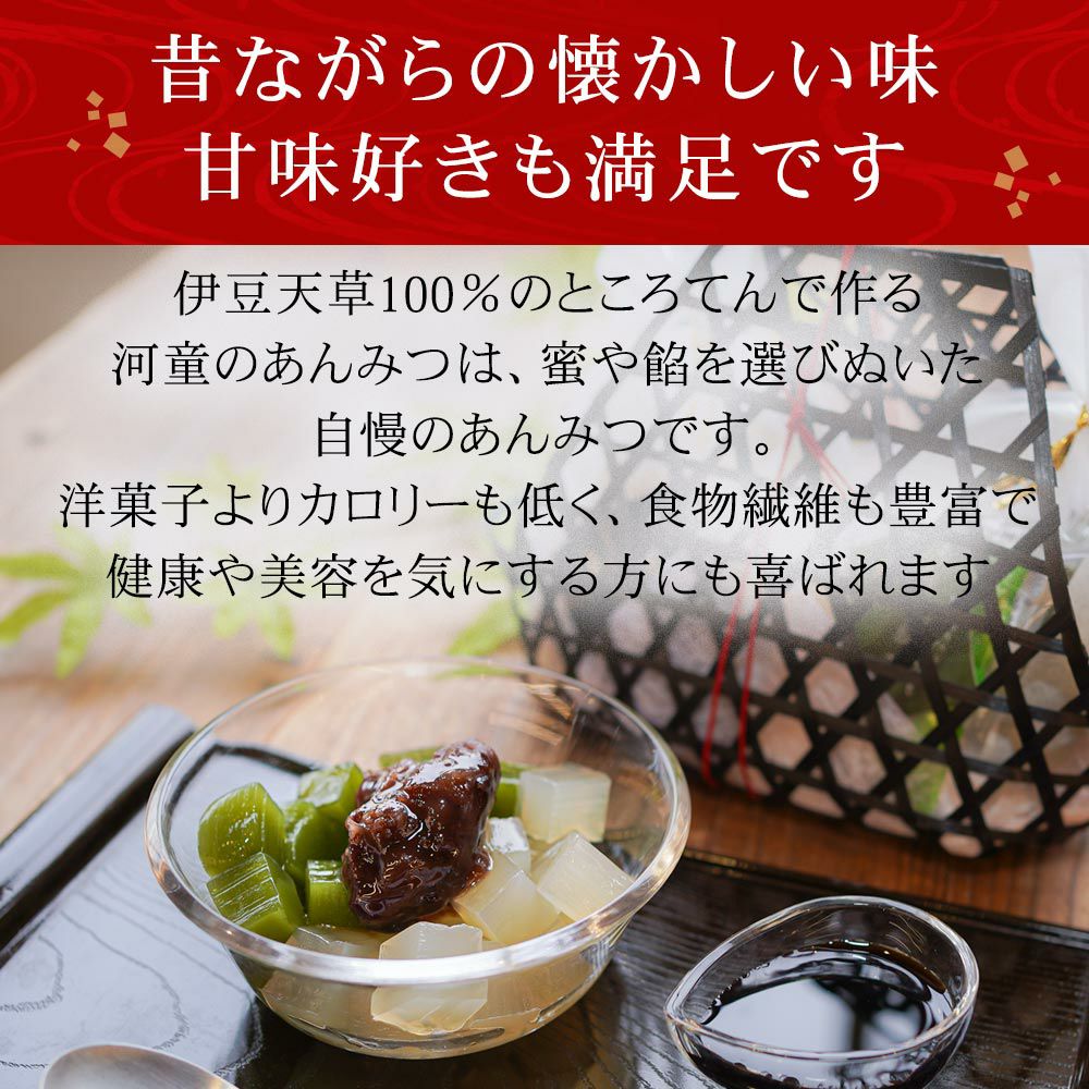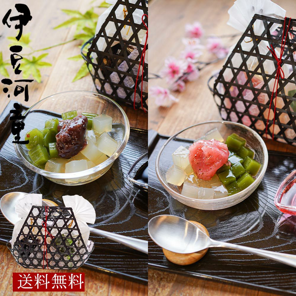京都老舗の製餡所特製のさくら餡は、塩漬けの桜の葉を刻み練りみ、ほんのり桜の香りがします。伊豆河童の角切りところてんにぴったりと合います。