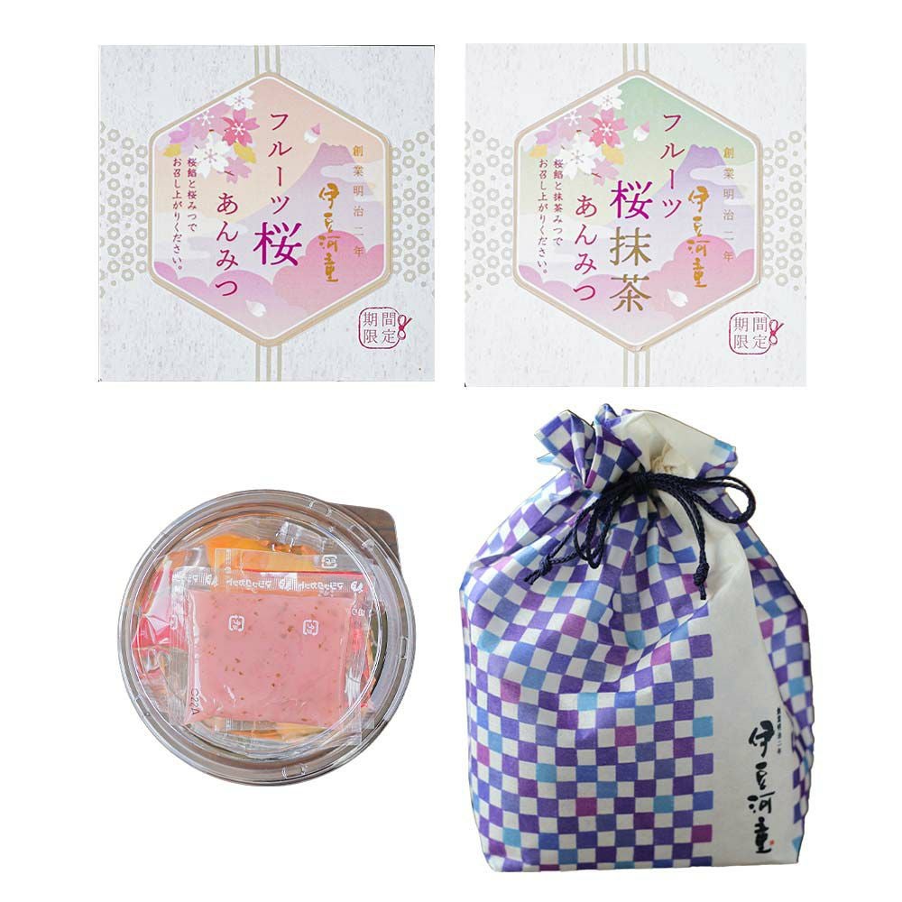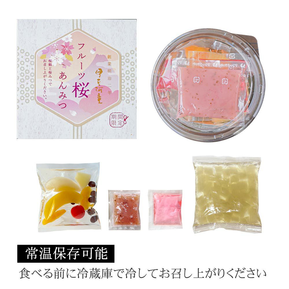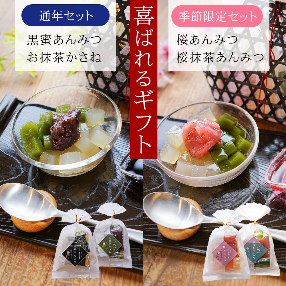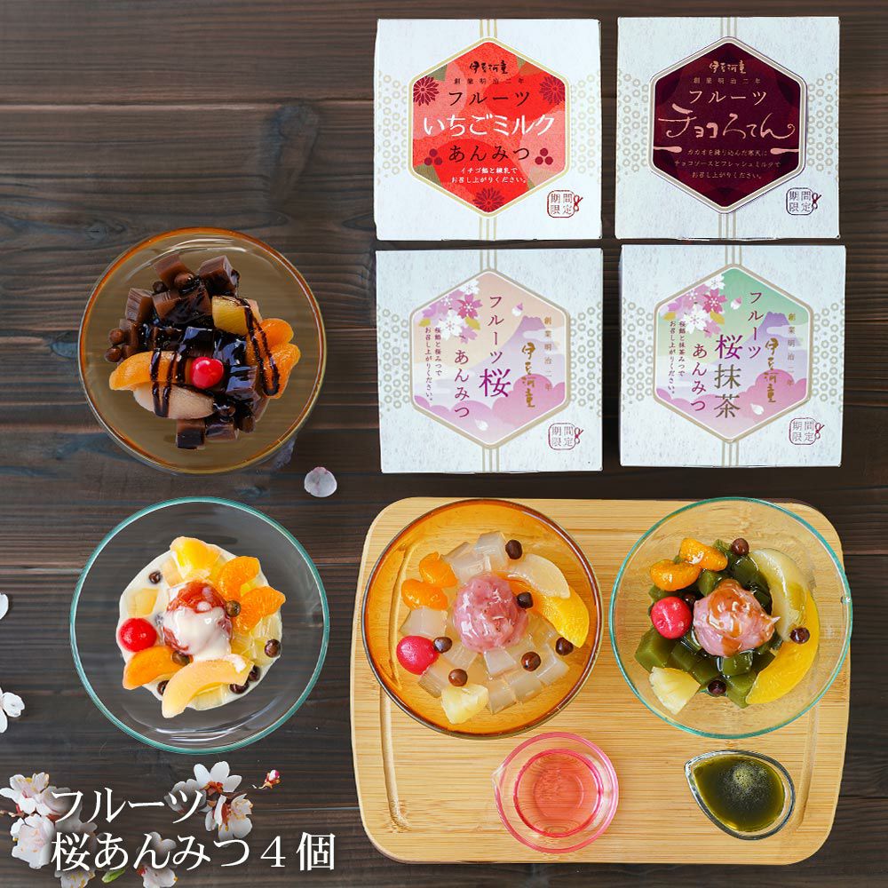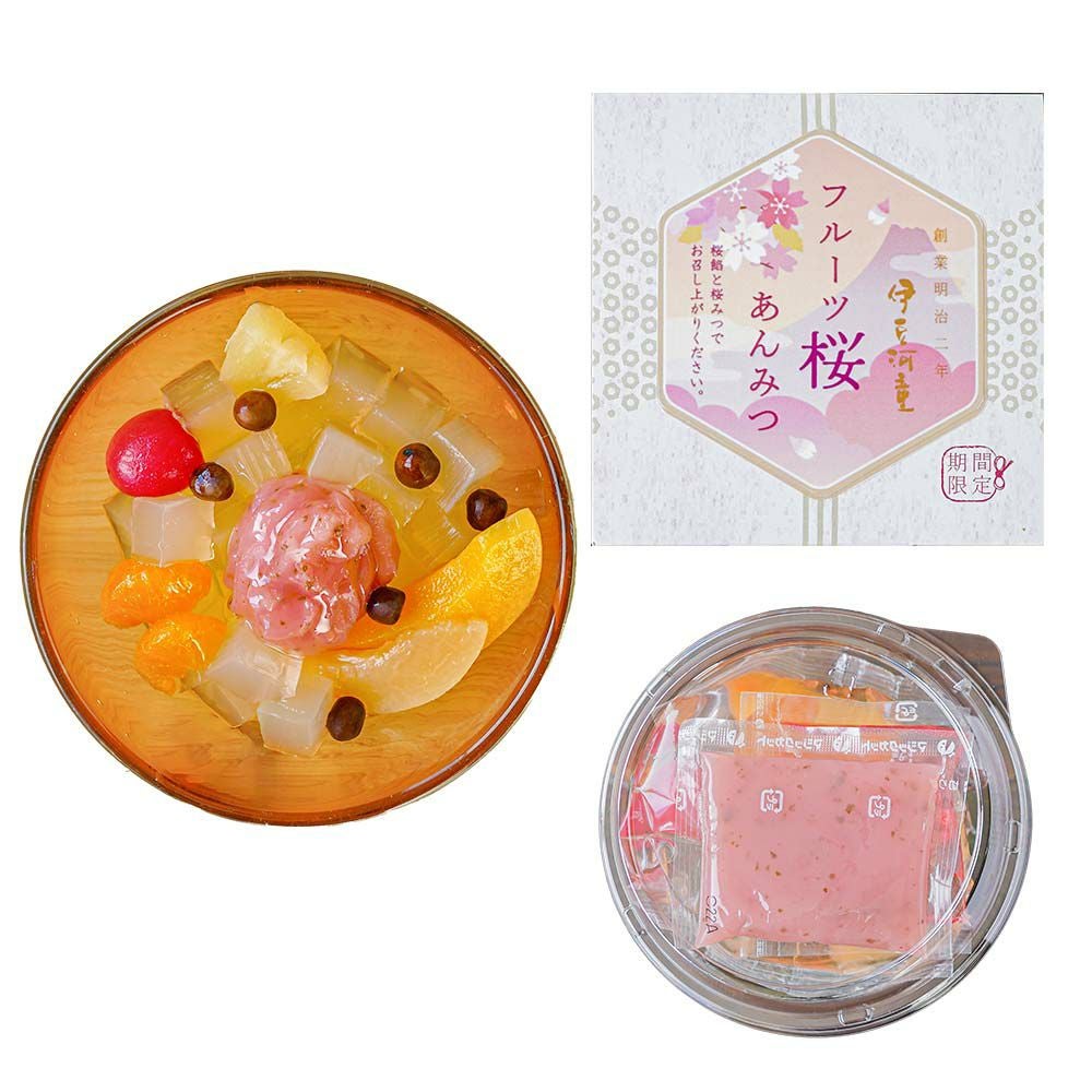 桜あんみつにフルーツが加わりました。季節の贈り物、大切な方へのプレゼントに。季節限定のあんみつ詰め合わせたセットはおすすめです。