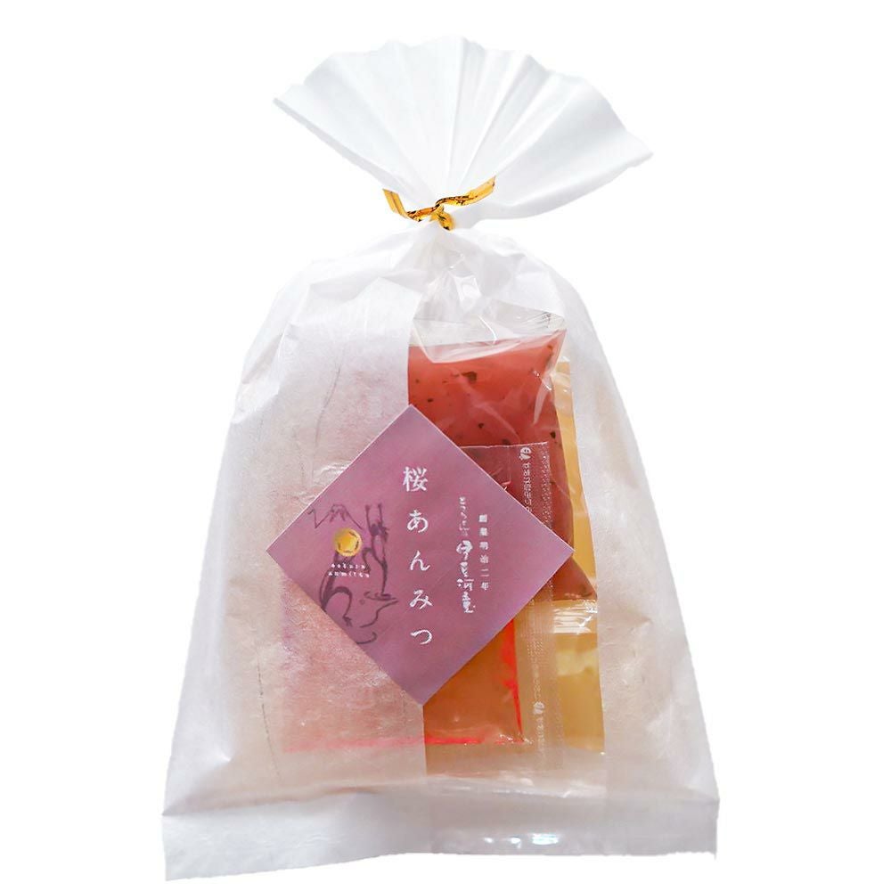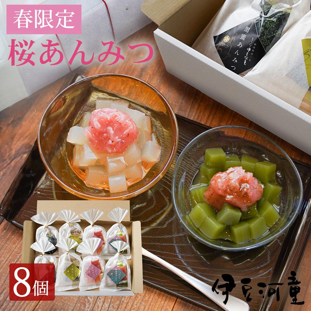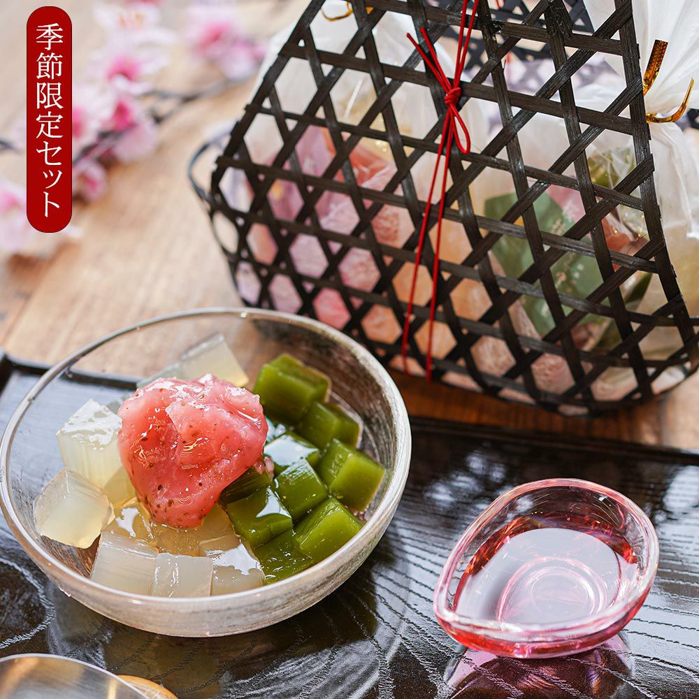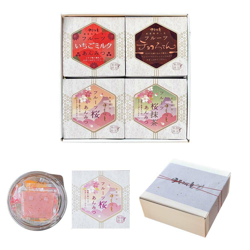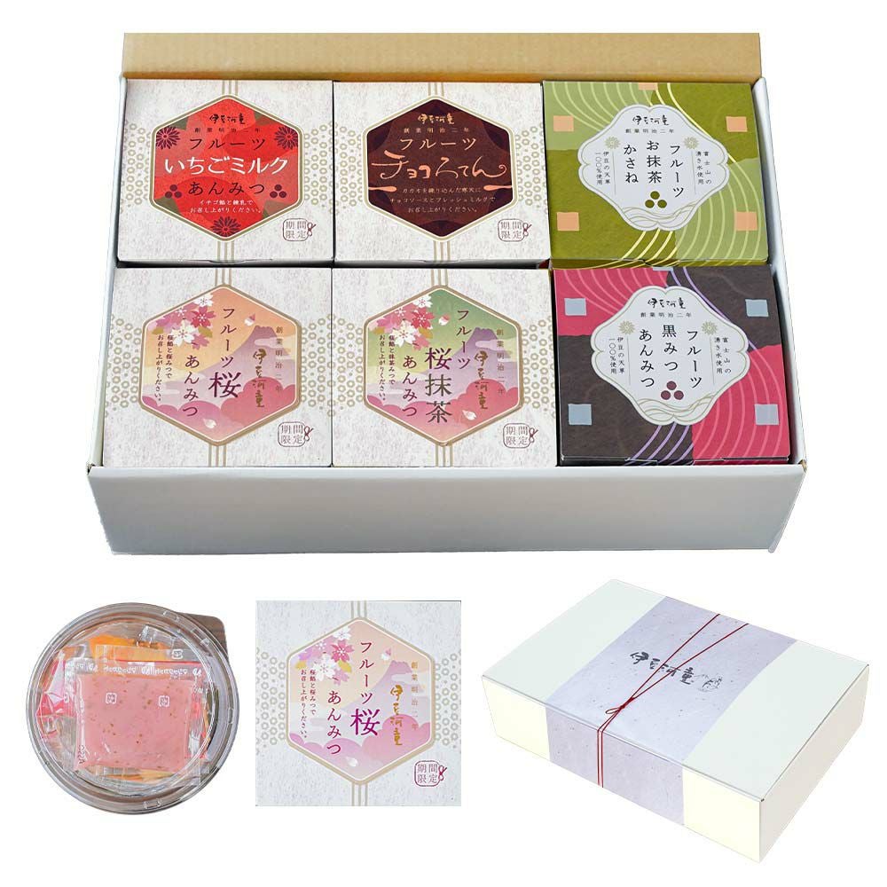 桜あんみつにフルーツが加わりました。季節の贈り物、大切な方へのプレゼントに。季節限定のあんみつ詰め合わせたセットはおすすめです。