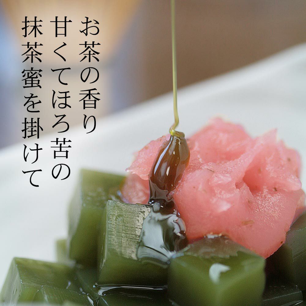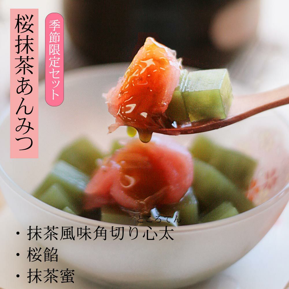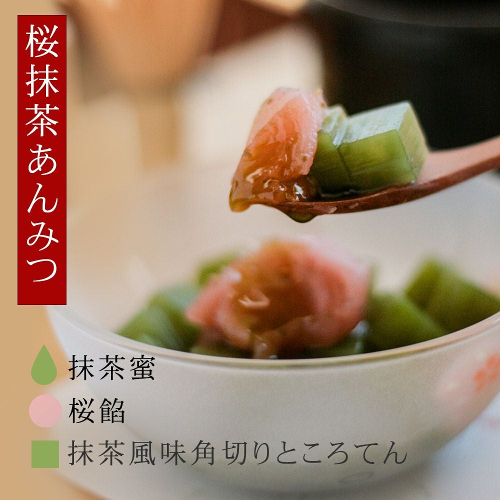 春の餡蜜と言えば「桜あんみつ」です。毎シーズン、楽しみにしてくださっているお客様がいるロングセラー商品。抹茶角ところてんと抹茶蜜mの「桜抹茶あんみつ」もございます。