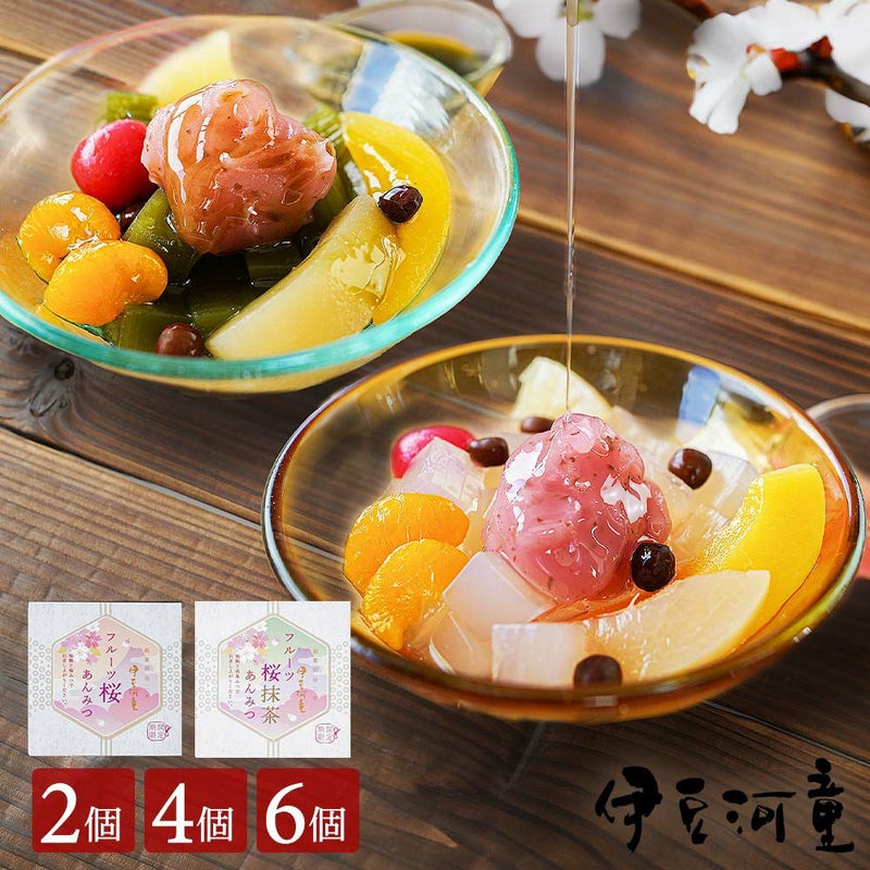 フルーツ桜あんみつは、2個セット、4個セット、6個セットがあります。ギフトやプレゼントに喜ばれるあんみつセットです。