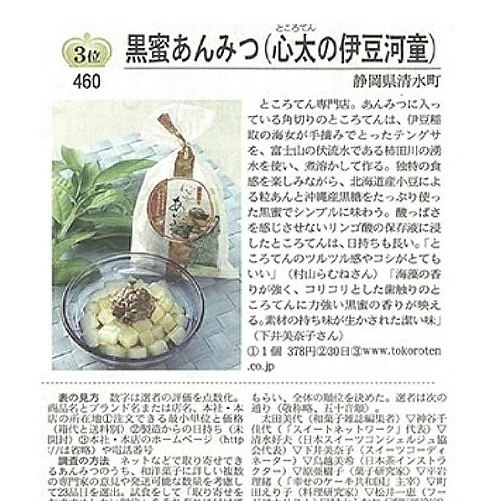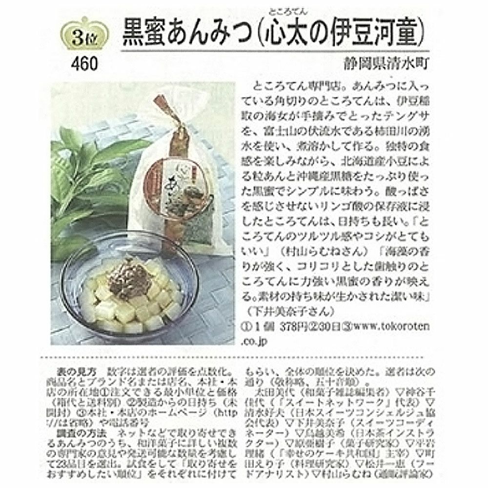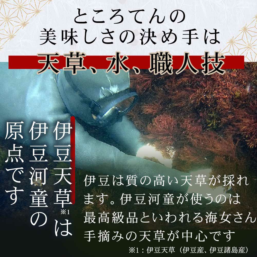 創業明治二年、伊豆河童のあんみつは、寒天ではなくところてんを使った珍しいあんみつです。伊豆河童のところてんは、伊豆天草100%、富士山の湧水を使い熟練職人が昔ながらの製法で手づくりする「本場伊豆のところてん」です。ご自宅で甘味処のあんみつを食べたい方、本物を求める方へのギフトや特別なプレゼントにたいへん喜ばれます。