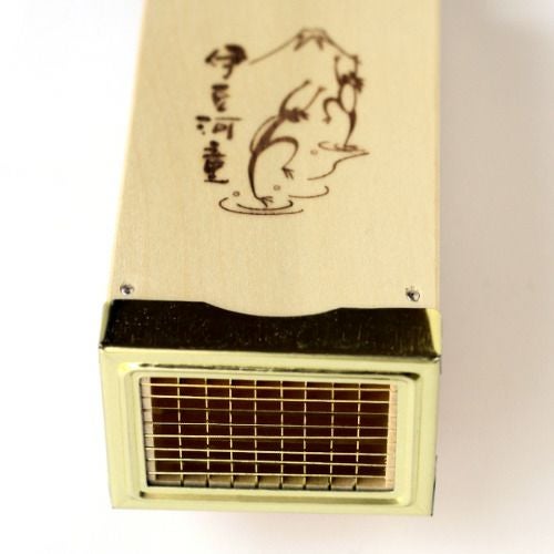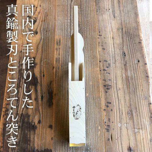 本体の材質はホオノキ、刃は真鍮製、真鍮製の刃は板状です。伊豆河童のしっかりとした固さのところてんでも、つるりと突き出せます。持つのにちょうどよく、ところてんが付きやすい大きさです。