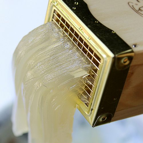 板状の刃なので、ところてんをスッと突き出せ、断面がつるりとなめらか。とても食感のいいところてんが突きあがります。突き出した時のところてんの断面の違いは、美味しさに表れています。テグスの糸などのところてん突きだと、つるっとしたところてんの食感を出すことが、難しかったのです。