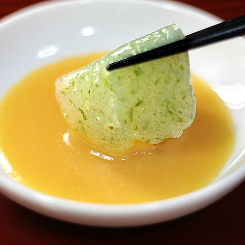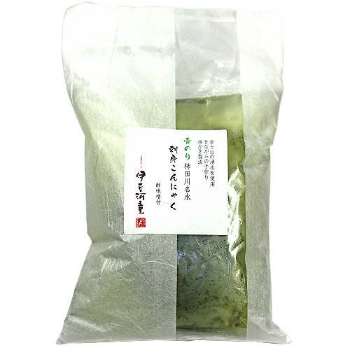 国産のこんにゃく粉から手作りします。青のりや唐辛子入りの刺し身こんにゃくです。酒の肴やサラダにも。ローカロリーでヘルシーなこんにゃくは、食べごたえも腹持ちもよいですよ。