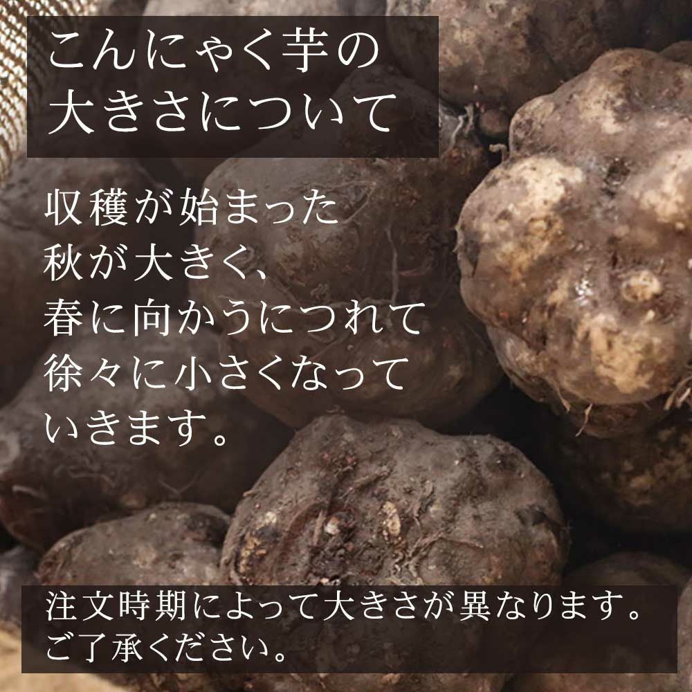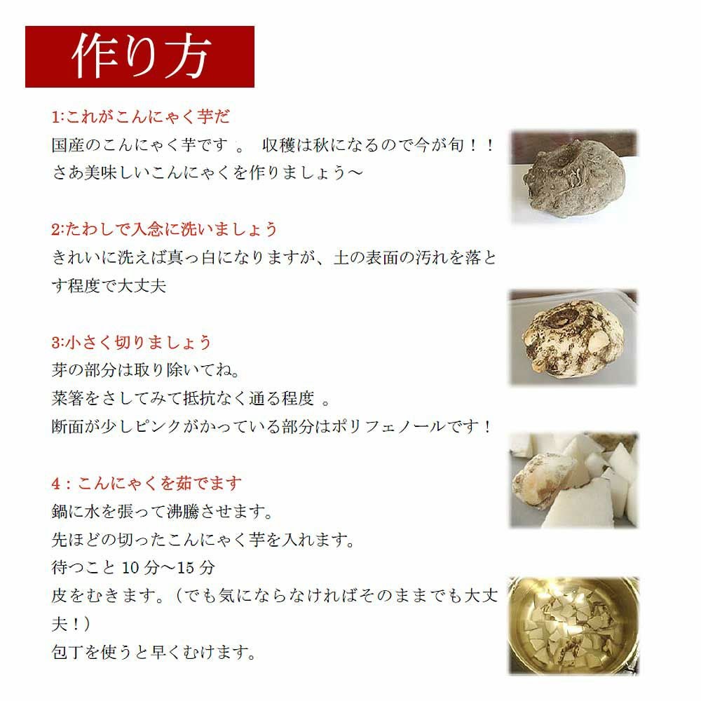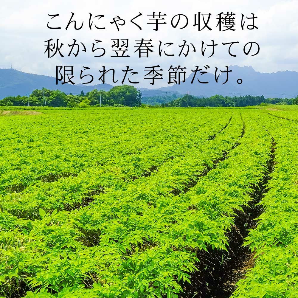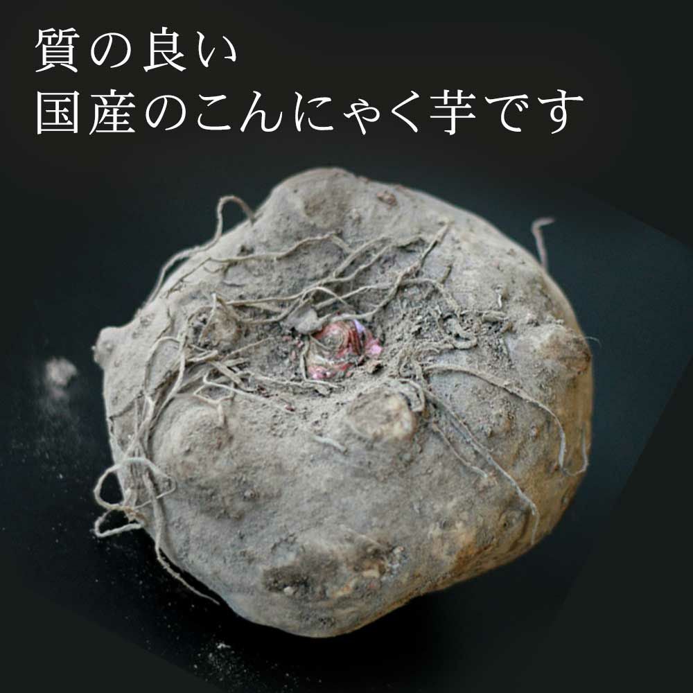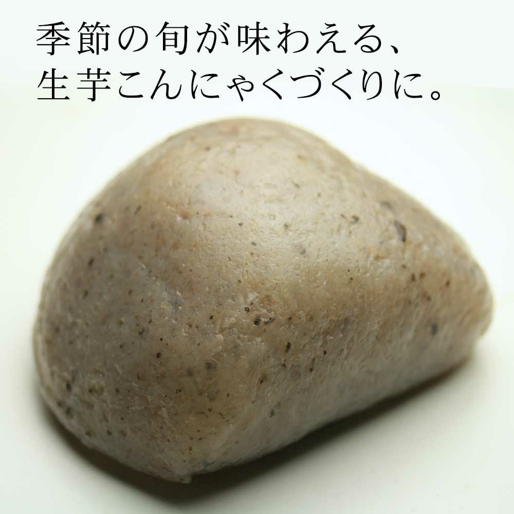 こんにゃく芋の収穫時期は、秋から春にかけて期間が限られています。この時期だけのおいしさです。国産のこんにゃく粉は、こんにゃく作りや、おからと一緒に混ぜてあげたり料理にお使いいただけますよ。