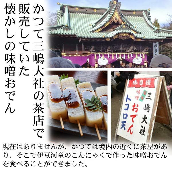 伊豆河童の近くには、由緒ある伊豆一宮三嶋大社があります。12世紀後半、源頼朝が源氏再興を祈願し、旗揚げをした由緒ある神社です。現在はありませんが、かつては境内の近くに茶屋があり、そこで味噌おでんを食べることができました。