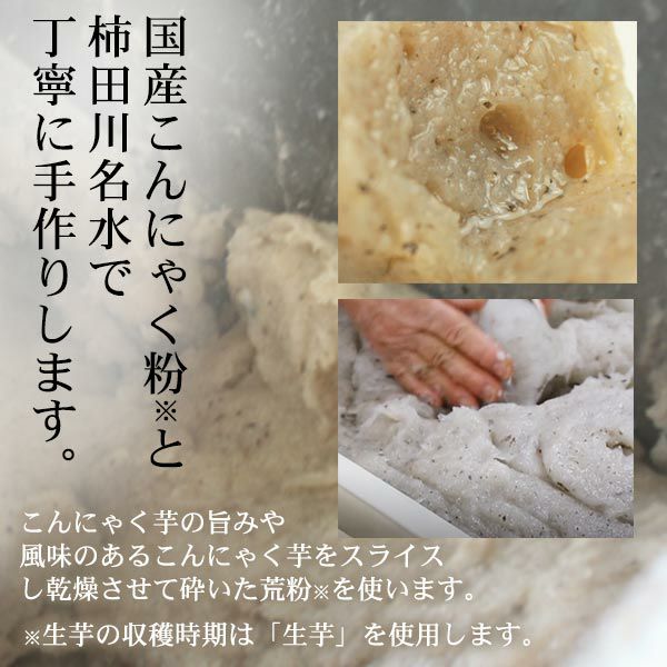 こんにゃく芋をスライスし乾燥させて砕いた「荒粉」を使います。荒粉をさらに精製した「精粉」よりもこんにゃく芋の旨みや風味があります。