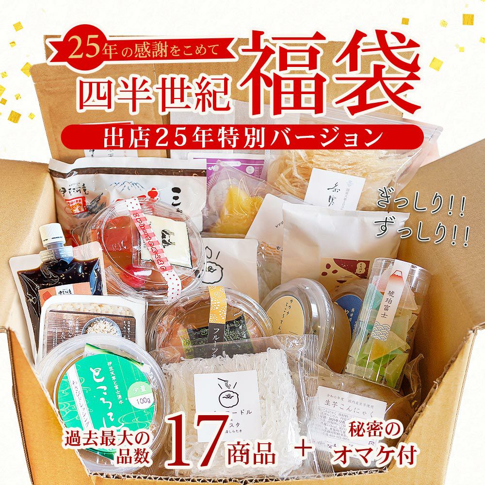 他の画像を見る 感謝を込めて 【四半世紀福袋】 伊豆河童の福袋 25周年記念 福袋 ところてん あんみつ セット 送料無料 ゼンパスタ 乾燥こんにゃく米 甘酒 他 たっぷり入ってめっちゃお得 送料無料 のし・包装不可 販売価格 ¥ 4,280 税込 販売を終了しました。 在庫切れ 毎年、発売からすぐに売り切れる人気の伊豆河童の福袋です。22周年の感謝の気持ちをこめて。柿田川名水ところてん、あんみつ、糸寒天、乾燥こんにゃく米、ゼンパスタなど、伊豆河童の色々をお試しいただける人気商品とオマケの充実の内容です。今期もずっしりと詰め込みました。 詳細を見る お気に入りに登録