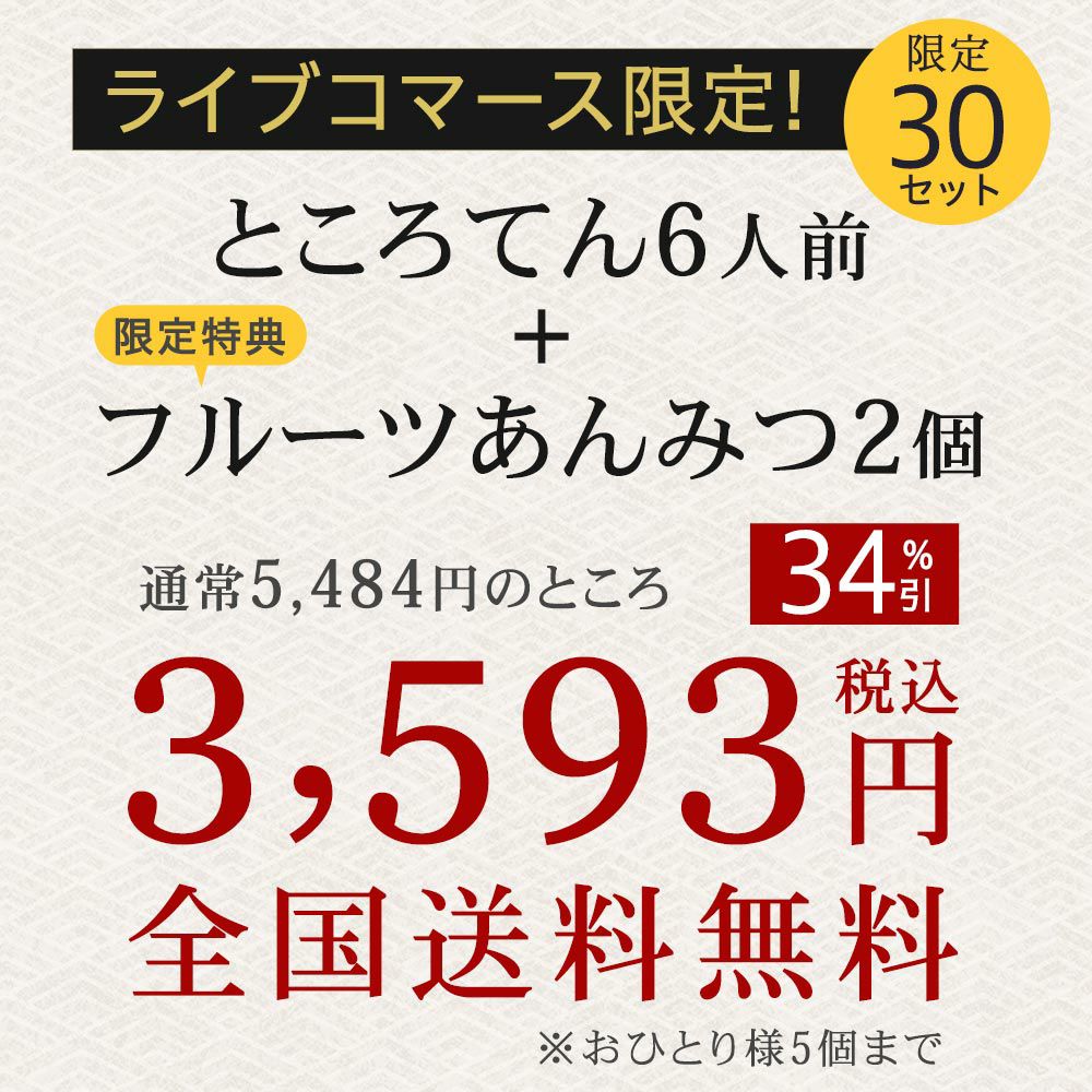 他の画像を見る 送料無料 おすすめ ライブコマース テレビ・雑誌で話題のところてん突き棒付セット 【追加50個販売中】 ライブコマース 柿田川名水 ところてん6人前 特製突き棒付き 販売価格 ¥ 3,593 税込 販売を終了しました。 詳細を見る お気に入りに登録