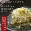 つるりとした口あたり、コリコリとしたほどよい歯ごたえ。舌先で押せばホロリとくずれるかたさ。最高級の伊豆産、伊豆諸島産天草と澄み切った柿田川名水を使って作る、本当に美味しいところてんです。