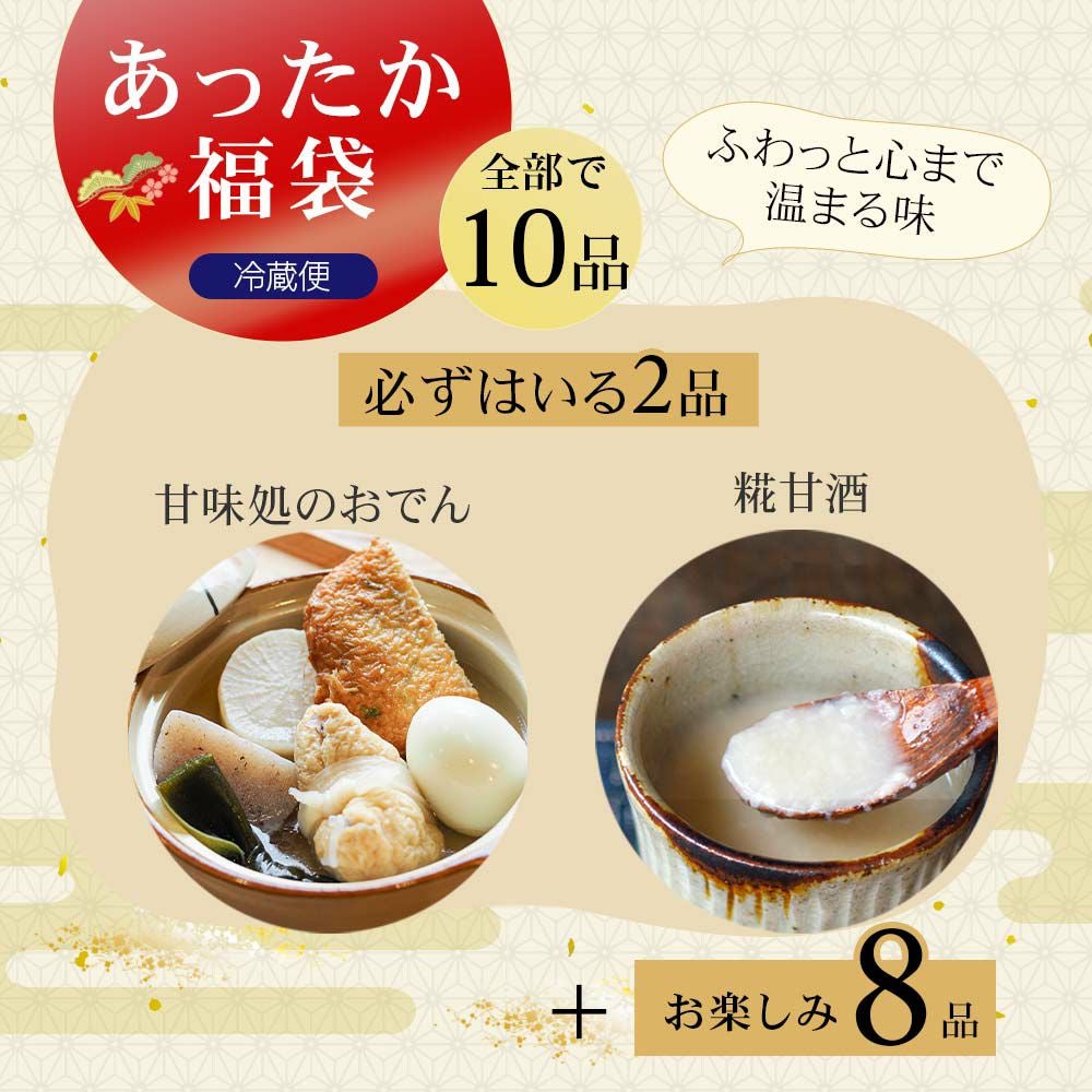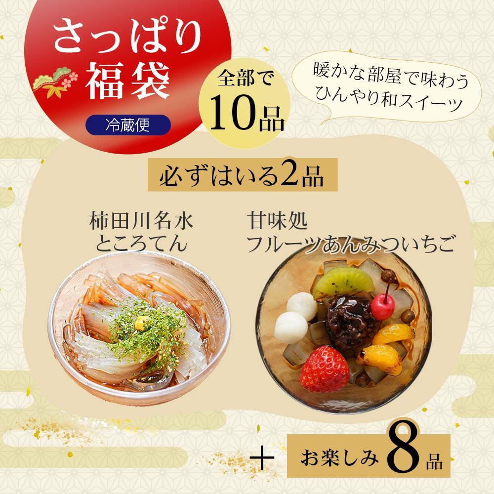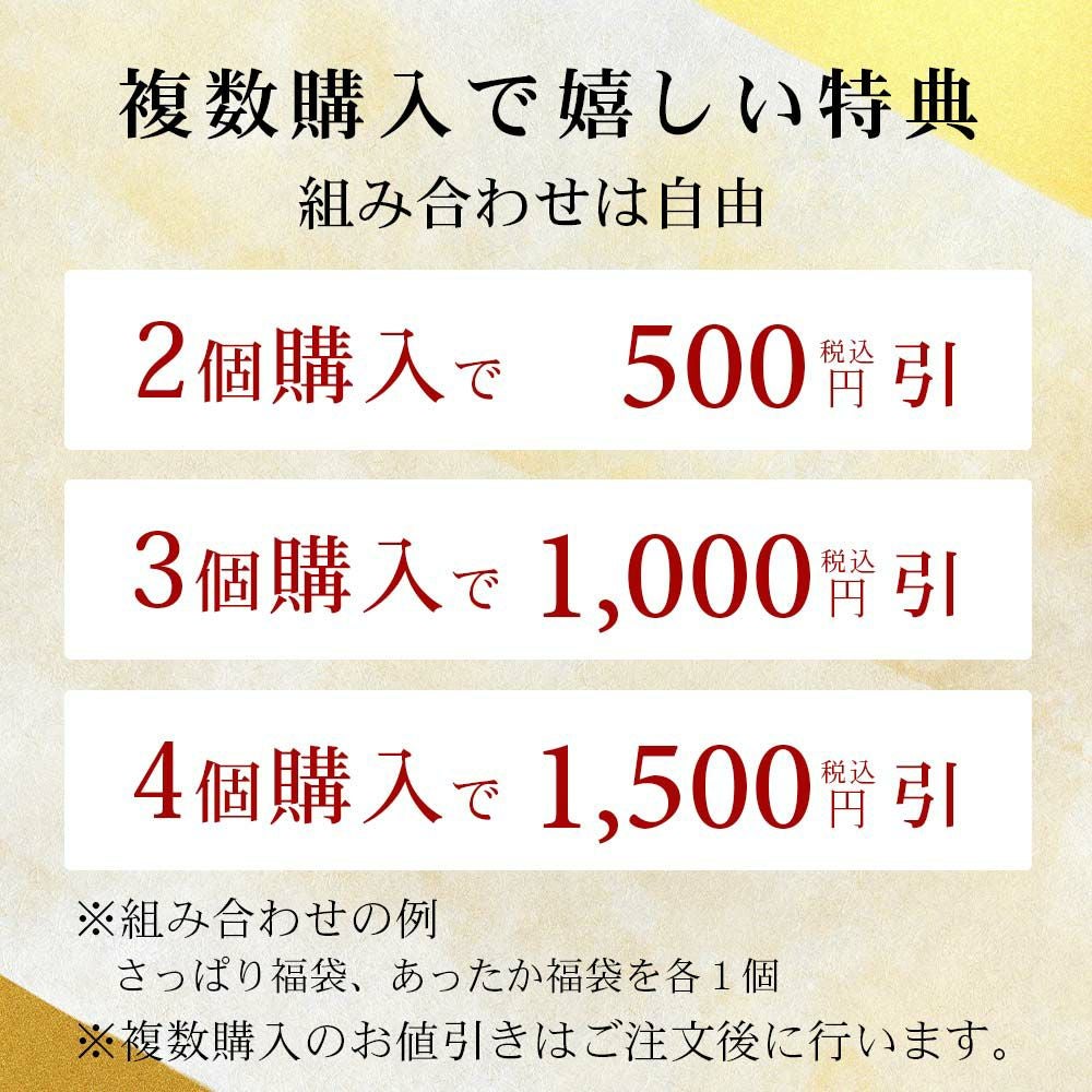 他の画像を見る 笑顔になる福袋 2種類から 選べる 年末年始福袋 2025-26 全10品入り ところてん フルーツあんみつ いちご おでん 糀甘酒 など スイーツ たっぷり お得 セット割引 送料無料 冷蔵便 送料無料 数量限定 販売価格 ¥ 5,000 税込 販売を終了しました。 在庫切れ 年末から新春にかけての、お楽しみ福袋です。あったか福袋、さっぱり福袋の2種類からお選びください。 詳細を見る お気に入りに登録