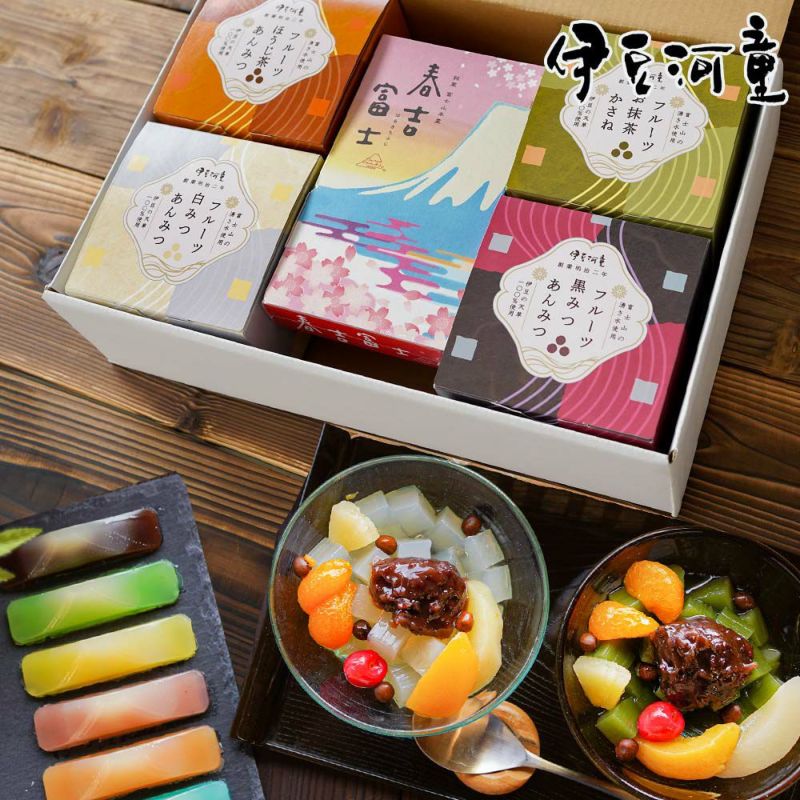 伊豆天草※100%のところてんで作る【伊豆河童のフルーツあんみつ】は、蜜や餡を選びぬいた自慢のあんみつです。洋菓子よりカロリーも低く、食物繊維も豊富で【健康】や【美容】を気にする方にも喜ばれます。
